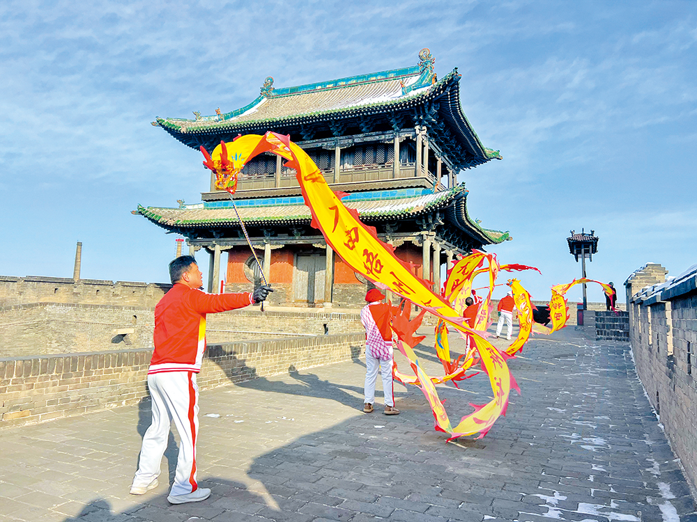 12月19日,来自广西壮族自治区梧州市的舞龙爱好者在平遥古城城墙上进行舞龙表演。尽管天气寒冷,依然有不少游客来到平遥古城参观游览,领略古城文化,乐享户外时光。