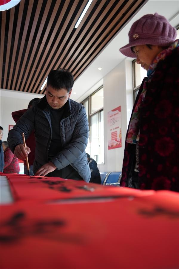 1月23日上午,在榆次火车站候车大厅内,晋中市硬笔书法协会会员们挥毫泼墨,一副副春联在他们的笔下熠熠生辉。“五风十雨皆为瑞、万紫千红总是春”“春回大地龙舞腾、福满门前祥云扬”这些寓意吉祥的春联,为旅客们的归途增添了喜庆的氛围。