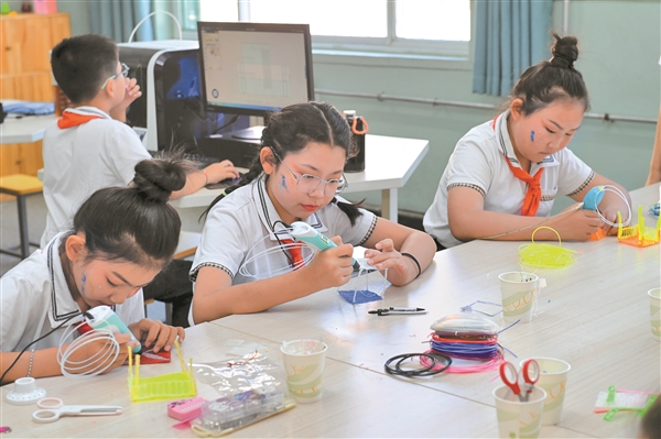 6月17日,榆次区安宁小学手工社团课堂上,学生们通过热熔胶枪、纸板等材料,用灵巧的双手制作出一组组惟妙惟肖的手工作品。