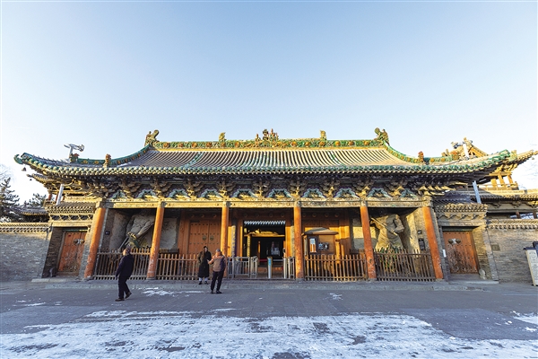 琉璃影壁及屋顶琉璃构件,采用了高浮雕塑造手法,主题突出,造型生动。最值得一提的是乐楼,建造别致,音响效果极佳。