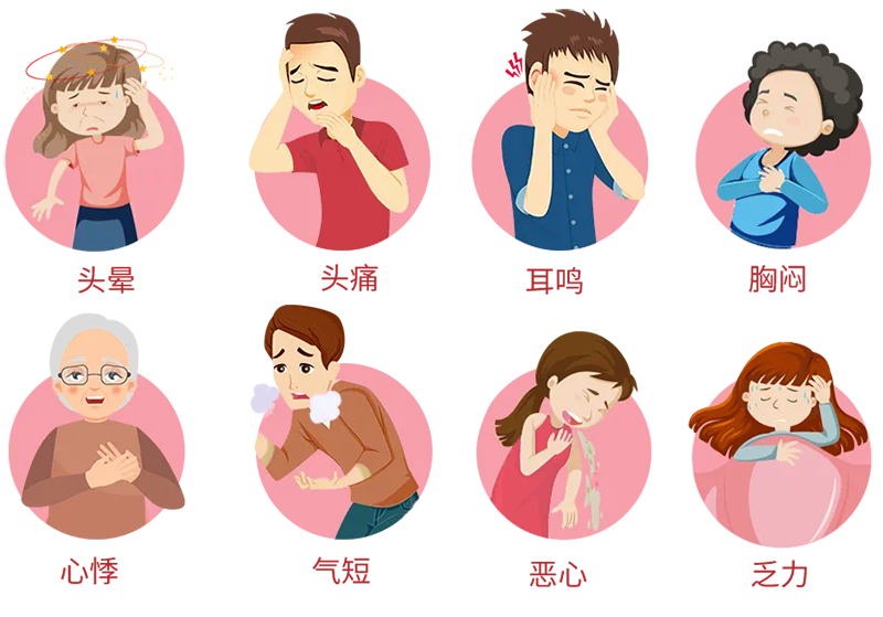 高血压患者常见临床症状有头晕、头胀、耳鸣、颈痛、胸闷、心悸、气短、恶心、乏力等。同时,高血压还伴发多种并发症,对心、脑、肾、眼等器官及大血管造成损害。