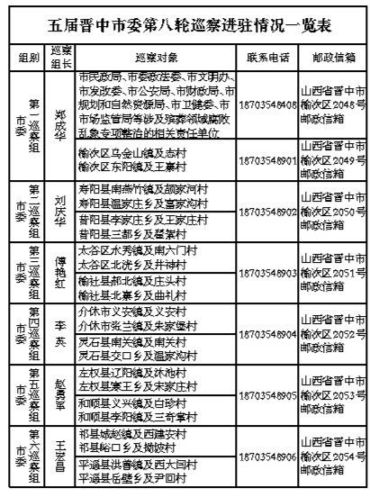 经市委批准,市委派出6个巡察组,分别对榆次区乌金山镇、太谷区水秀镇等22个乡镇党委及22个重点村开展提级巡察;对市民政局、市委政法委、市文明办、市发改委、市公安局、市财政局、市规划和自然资源局、市卫健委、市市场监管局等涉及殡葬领域腐败乱象专项整治的相关责任单位党组织开展专项巡察。近日,市委6个巡察组完成对五届市委第八轮巡察各被巡察单位的进驻工作。