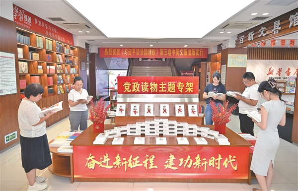 8月4日,在晋中新华书店,《习近平谈治国理政》第五卷整齐陈列在最醒目位置,众多读者驻足翻阅、踊跃购买。