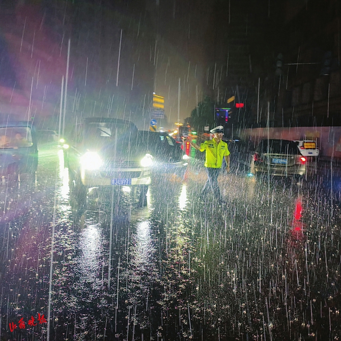 在这场与暴雨的较量中,交警以高度的责任感和无畏的坚守,最大限度地降低了恶劣天气对交通的影响。湿透的警服、忙碌的身影,成为暴雨中最令人安心的风景线,交警用实际行动为群众出行撑起了一把“安全伞”,守护着每一位市民平安出行。