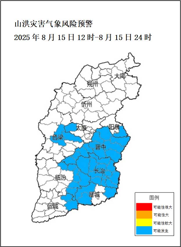 山西省水利厅和山西省气象局2025年8月15日12时00分联合发布山洪灾害气象风险预警:2025年8月15日12时至8月15日24时,受强降雨影响,我省太原西北部、阳泉南部、晋中、吕梁中东部、长治、晋城西部和东部、临汾东部、运城东部8个市39个县可能发生山洪(蓝色预警)。其他地区也可能因局地短历时强降水引发山洪灾害,请各地注意做好实时监测、防汛预警和转移避险等防范工作。