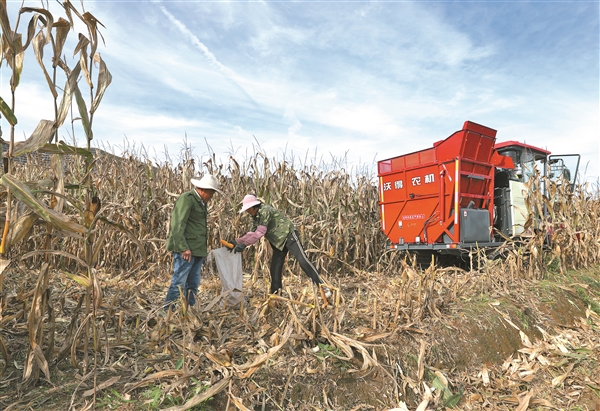 为此,贾令镇一方面对接上级协调了3台玉米收割机,破解传统农机“陷车”难题;另一方面组织党员干部实地摸排地块积水,为作业扫清障碍。动员组建“党员+农机专班+农技小分队”的抢收组合,抢抓晴好天气窗口推进收割。“往年雨天收这点粮得两天,今年有适配收割机,还有干部全程盯守,半天就收完了!”看着满车粮食,张晋忠难掩激动。