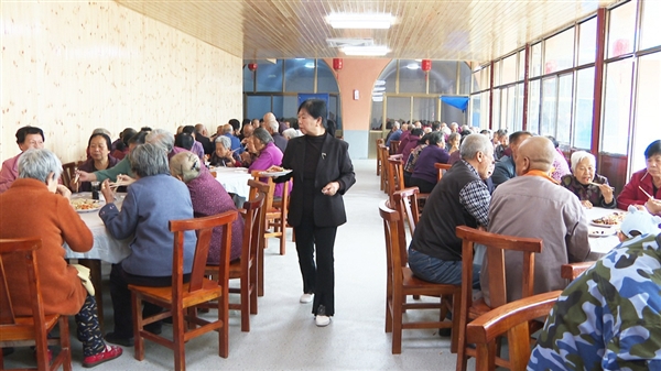 在灵石县南关镇道美村老年人日间照料中心,老人们在整洁的餐厅就餐。