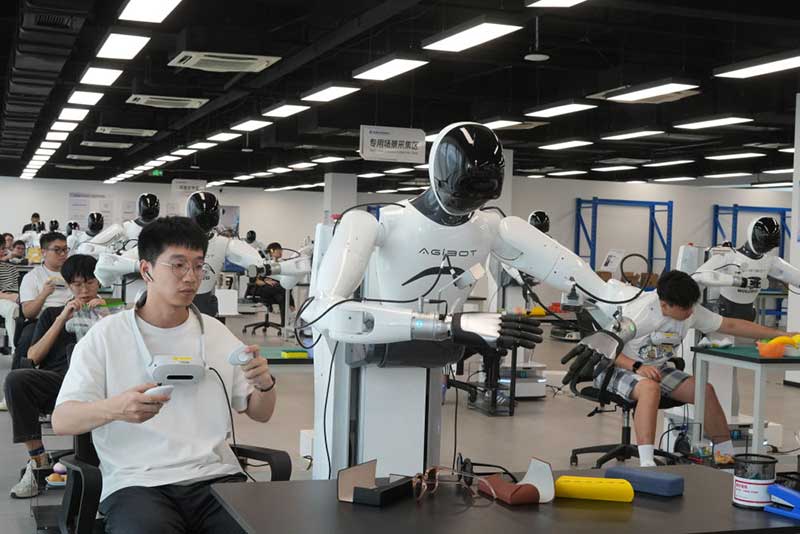 在位于浙江绍兴上虞区的杭州湾具身智能创新中心,工作人员操作机器人进行不同场景作业的数据采集(2025年9月23日摄)。新华社记者 翁忻旸 摄