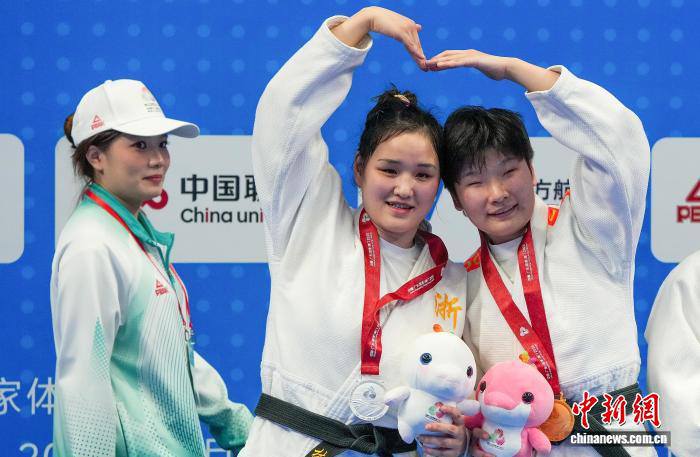 12月11日,在盲人柔道女子J1-70公斤级颁奖仪式上,金牌得主湖南队选手刘立(右)与银牌得主浙江队选手林树明(中)“比心”合影。 (残特奥会信息服务 供图)
