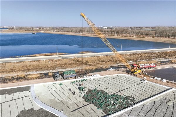 12月24日,在平遥县惠济河垂直流人工湿地水质净化工程工地,施工人员冒严寒、赶工期,加紧装填第五层滤石。