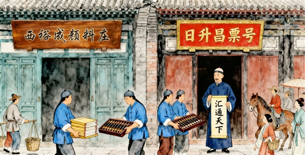 (这是清朝同治、光绪年间,人们对平遥城内十大票号全盛时期的形象表述,既有号名,又有方位,还有商号用房、牌匾等。)