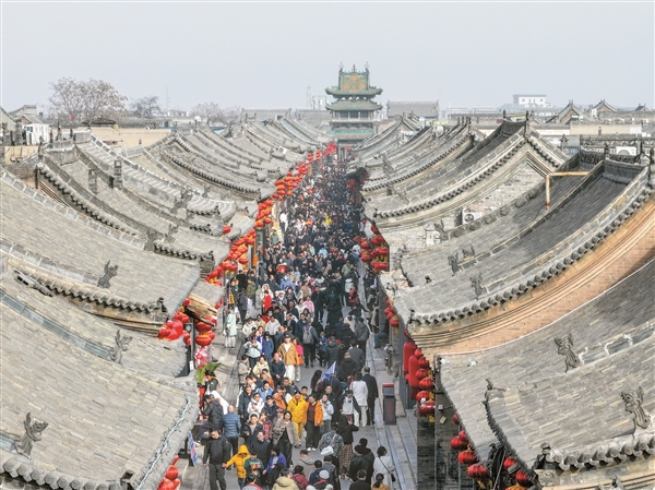 2月21日,游客在平遥古城游览观光,感受古城浓浓年味。通讯员 梁生仁 摄