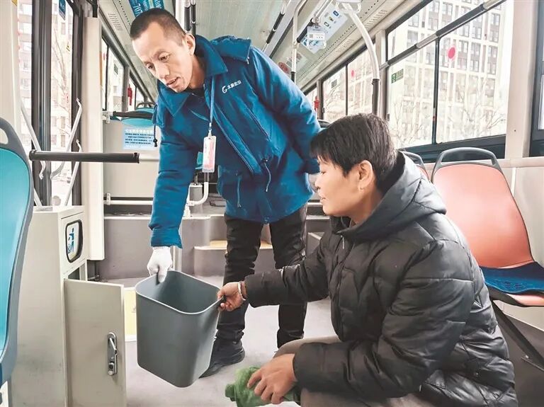 妻子史彩萍作为保洁员,天还未亮,就拿起清洁工具,对停车场地面、公交车辆内外进行全面清扫,擦拭座椅、扶手、车窗,清理卫生死角,不放过任何一处细节。为驾驶员营造整洁舒心的工作氛围,为乘客打造干净舒适的乘车环境。