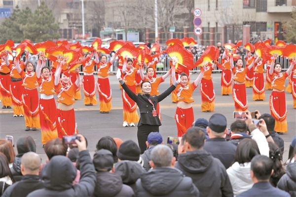来自榆次区各乡镇的精品民俗队伍轮番登场,威风锣鼓、背棍铁棍、秧歌旱船等传统节目依次亮相,演员们身着盛装,以行进式与定点表演相结合的方式,充分展现榆次本土民俗特色与新时代群众风貌,为新春佳节增添浓浓的年味。