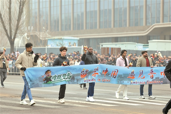 上午9时30分,汇演正式开始。21所驻地高校旗手方阵率先亮相,青春面庞与鲜艳校旗交相辉映,成为街头最亮眼的风景。山西传媒学院学生王梓豪高举旗帜,步伐铿锵:“能代表学校参加晋中社火汇演,我特别自豪!这不仅是一场表演,更是我们青年学子与家乡同心同行的宣言。”留学生们挥手致意,不同肤色、同频欢笑,让晋中社火多了一分国际范儿。