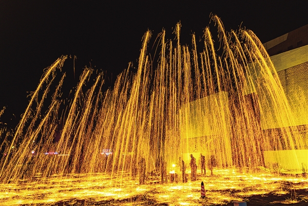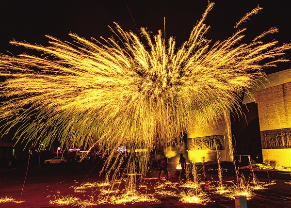 打铁花是我国流传已久的民间传统焰火,也是重要的非物质文化遗产。灼灼铁花与古朴的博物馆建筑交相辉映,场面蔚为壮观。绚烂的铁花不仅为当地群众和游客带来了一场震撼的视觉盛宴,更寄托着人们对新的一年生活红红火火、蒸蒸日上的美好期盼。