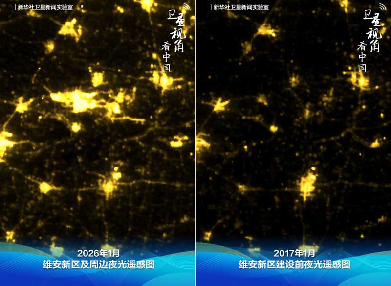 起步区,是雄安新区的主城区。夜光遥感下,闪烁的亮光和绵延的灯带见证了雄安新区的崛起。截至2025年底,雄安新区累计开发面积215平方公里,建设楼宇5300余栋,总建筑面积超5800万平方米。